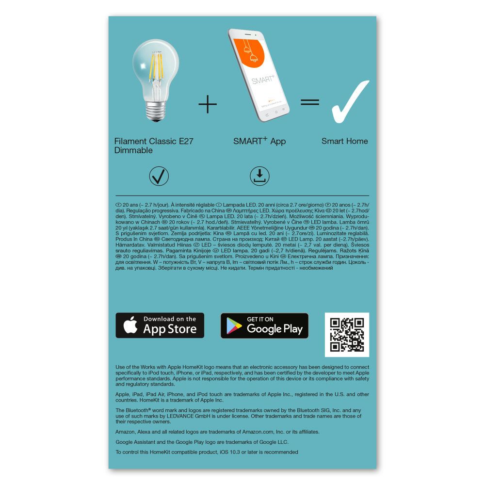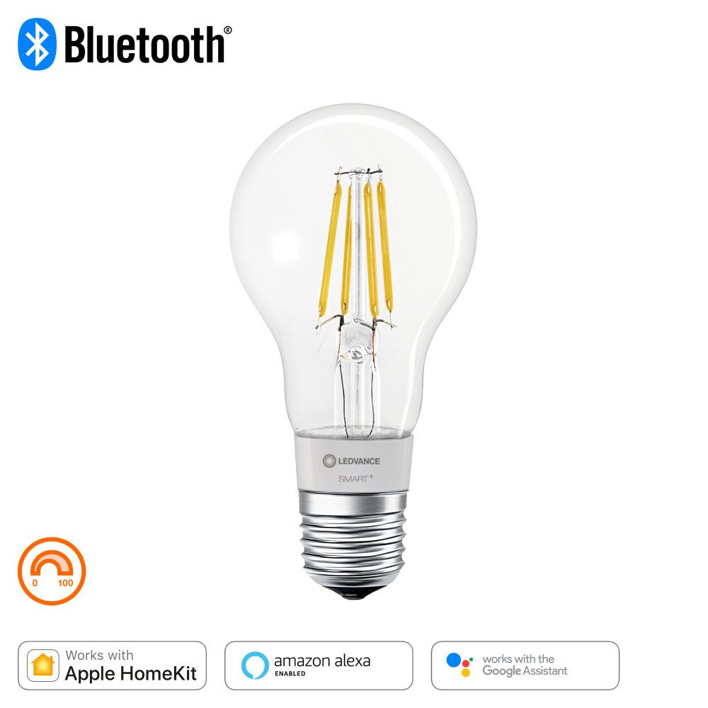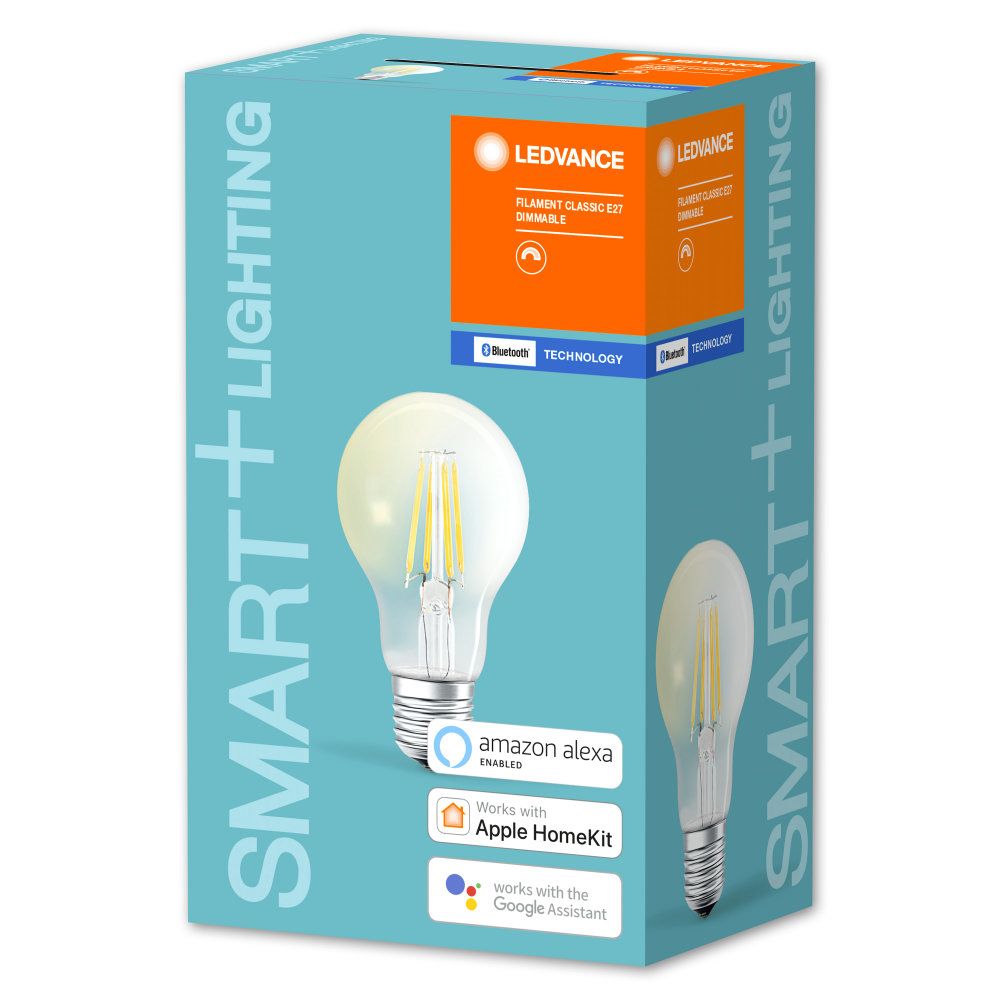 - Freitextfeld 1: <p><strong>Produktvorteile</strong></p> <ul class="simplelist"> <li>Lampen mit innovativer LED-"Filament"-Technologie</li> <li>Einfache Installation und Nutzung</li> <li>Bis zu 80 % weniger Energieverbrauch gegenüber Halogenlampen</li> <li>Enthält kein Quecksilber</li> </ul> <p><strong>Anwendungsgebiete</strong></p> <ul class="simplelist"> <li>Allgemeinbeleuchtung</li> <li>Außenanwendungen nur in geeigneten Leuchten</li> </ul> <p><strong>Produkteigenschaften</strong></p> <ul class="simplelist"> <li>LED-Lampe mit intelligenter kabelloser Steuerungstechnik</li> <li>Verfügbar mit klarem oder bernstein-gold getöntem Glaskolben</li> <li>Steuerung über LEDVANCE SMART + App (ab Android 6.0) oder Apple Home App (ab iOS 10)</li> <li>Für vollen Funktionsumfang bei Steuerung über Apple Home App Verbindung mit Apple TV (ab tvOS 10) oder iPad (ab iOS 10) notwendig</li> <li>Dimmbar</li> <li>Netzwerkprotokoll: Bluetooth</li> <li>Lebensdauer: bis zu 20.000 h</li> </ul> <p><strong>Technische Ausstattung</strong></p> <ul class="simplelist"> <li>Für Steuerung über LEDVANCE SMART + App Android-Smartphone (ab Android 6.0) erforderlich</li> <li>Für Steuerung über Apple Home App iPhone (ab iOS 10), iPad (ab iOS 10), Apple TV (ab tvOS 10) oder Apple Watch (ab watchOS 2) erforderlich</li> </ul>