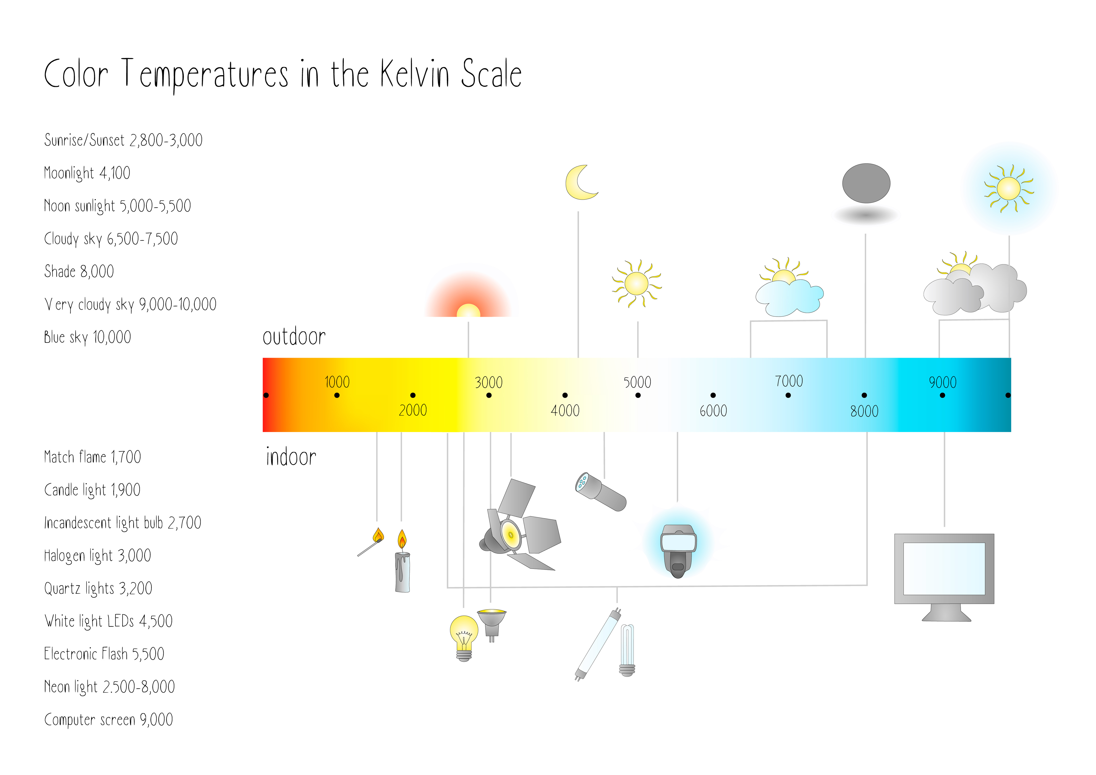 Übersicht der Farbtemperaturen in Kelvin anhand von alltäglichen Beispielen.