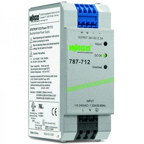 EAN: 4045454908195Geliefert wird eine Verpackungseinheit zu 1 Stück. Ausgangsspannung DC 24 V, 2,5 A, leerlauf- und kurzschlussfest, einstellbare Ausgangsspannung, LED-Statusanzeige Hinweise Primär getaktete StromversorgungSelbstkühlung durch natürliche Konvektion bei horizontaler EinbaulageGekapselt, für den SchaltschrankeinbauParallelschaltbar, reihenschaltbarGalvanisch getrennte Ausgangsspannung (SELV) gemäß EN 60950-1/UL 60950Normen/Bestimmungen: EN 60950, EN 61000-6-2, EN 61000-6-3, UL 60950, UL 508, ANSI/ISA 12.12.01 (Class I Div.2), ATEX, IEC ExEmpfohlene Vorsicherung: Leitungsschutzschalter 10 A, 16 A, Charakteristik B, C, für DC-Eingangsspannung ist eine externe DC-Sicherung erforderlichVerhalten bei Überlast: Konstantleistung (im Überlastbereich 1,15 ... 1,4 x Ia), bei Kurzschluss Abschaltung und automatischer WiederanlaufSonstigesName Wert EinheitKonformitätskennzeichnung CE Einschaltstrom < 30 A Überspannungsschutz durch Varistor im Primärstromkreis Verlustleistung PV 8,3 W (bei AC 230 V und DC 2,5 A) Schutzklasse I Voreinstellung DC 24 V Anschlusstechnik 1 WAGO-Serie 745 Verschmutzungsgrad 2 (gemäß EN 50178) MTBF 480000 h (gem. IEC 61709) Eingangsspannungsbereich AC 85 V ... 264 V; DC 130 V ... 373 V Ausgangsspannungsbereich DC 22 V ... 28 V einstellbar Frequenz 47 Hz ... 63 Hz Anforderungsstufe 3 / 50 Steckzyklen Eingangsnennspannung Ue Nenn AC 110 V ... 240 V Eingangsstrom Ie 0,7 A typ. bei AC 230 V; 1,2 A bei AC 115 V Ableitstrom < 1 mA Netzausfallüberbrückung > 20 ms bei AC 230 V Interne Sicherung F 2,5 A / 250 V Ausgangsnennspannung Ua Nenn DC 24 V (SELV) Ausgangsstrom Ia 2,5 A bei DC 24 V Restwelligkeit < 100 mV (Spitze − Spitze) bis 20 MHz Derating -3,3 % / K (> 50 °C bei AC 230 V) Regelabweichung [%] < 1 % Parallelschaltbar ja Rückeinspeisungsfestigkeit DC 28 V Wirkungsgrad 82 % typ. Prüfspannung Pri. - PE AC 1,5 kV Prüfspannung Pri.–Sek. AC 3 kV Prüfspannung Sek. - PE AC 0,5 kV Schutzart IP20 gemäß EN 60529 Betriebsanzeige LED grün (DC 24 V O.K.), LED rot (Überlast) Kurzschlussfest ja Überspannungskategorie II Leerlauffest ja eindrähtig, anschließbar 1 0,08 … 4 mm² / 28 … 12 AWG Abisolierlänge 1 8 … 9 mm / 0.31 … 0.35 in Brandlast [MJ] 4.4 MJ Gewicht [g] 596 g Breite 50 mm / 1.969 in Höhe 92 mm / 3.622 in Tiefe 136 mm / 5.354 in Lagertemperatur -25 °C ... +85 °C Montageart Tragschiene DIN 35 Umgebungstemperatur -10 °C ... +70 °C Befestigungsart Tragschienenmontage (EN 60715) Klimaklasse 3K3 (gemäß EN 60721) Relative Feuchte 95 % (keine Betauung zulässig)