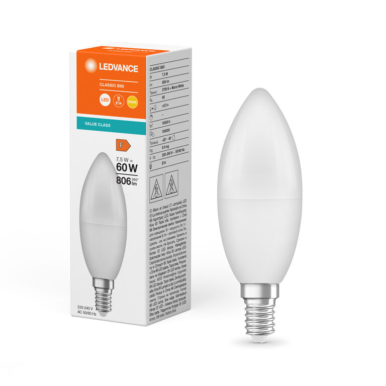 Osram / Ledvance LED Kerze B matt 200° Value 7,5-60W/827 warmweiß 806lm E14 220-240V