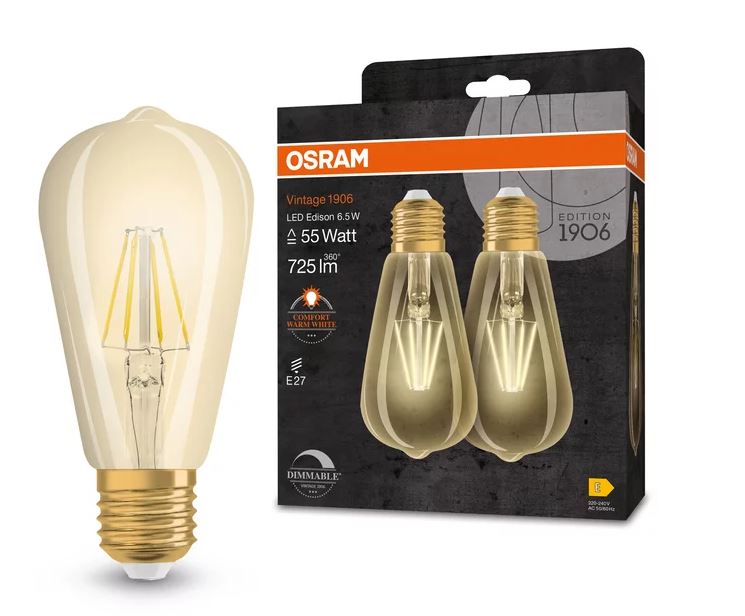 Osram LED Filament Vintage 1906 Edison ST64 gold 300° 6,5-55W/824 extra warmweiß 725lm E27 220-240V dimmbar 2er Blister