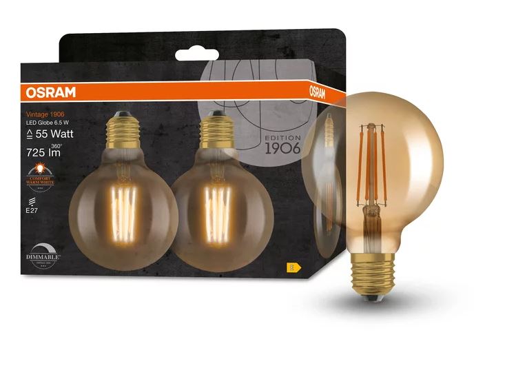 Osram LED Filament Vintage 1906 Globe G95 gold 300° 6,5-55W/824 extra warmweiß 725lm E27 220-240V dimmbar 2er Blister