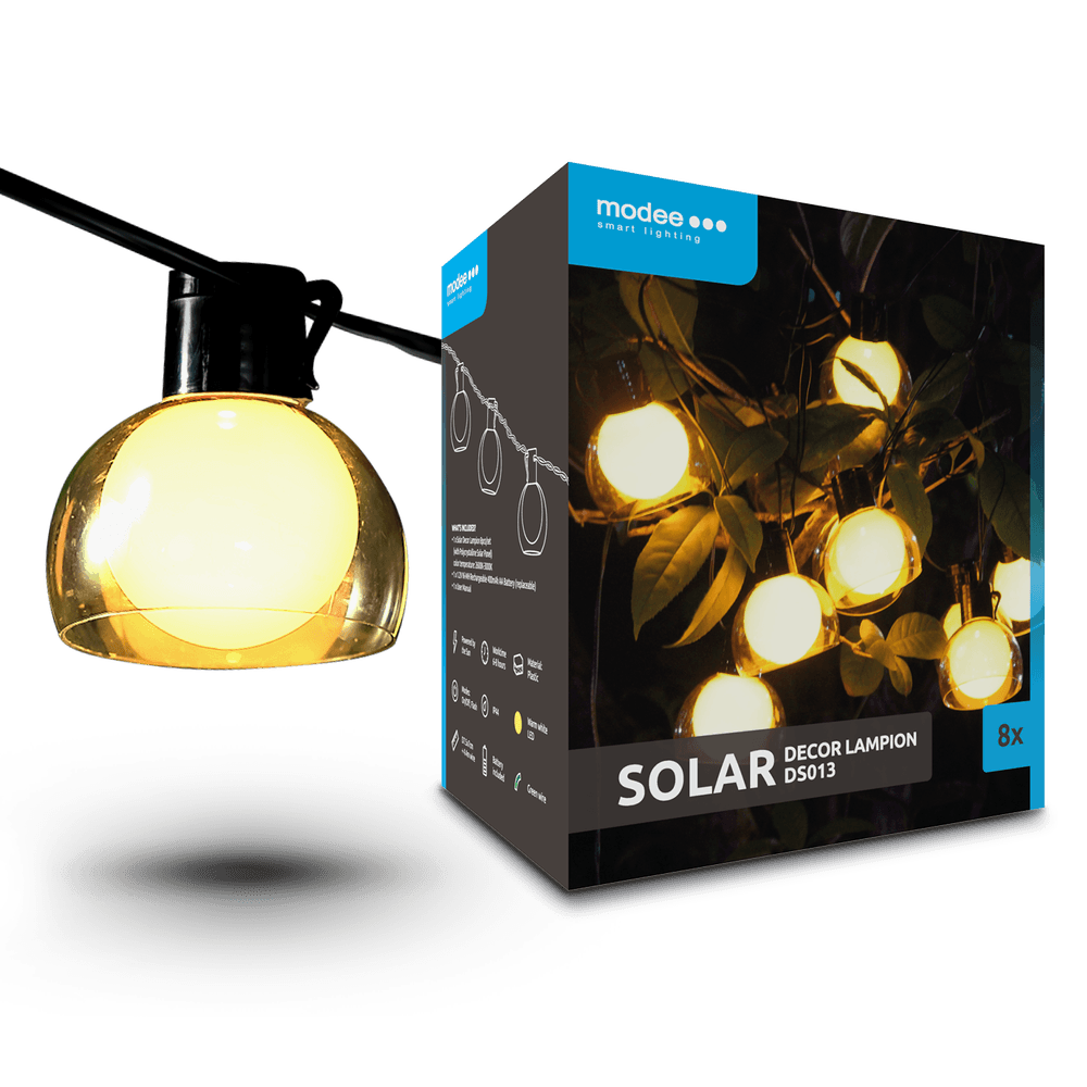 Modee Solar Lichterkette 4,4m 8 LED Laterne 75x70mm Kunststoff 2600-3000K IP44 1,2V Batterie 2 Funktionen