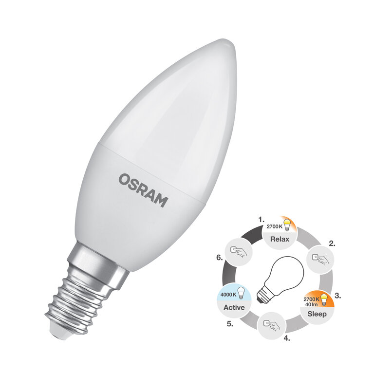 Osram / Ledvance LED Superstar Kerze B matt 200° 3xclick Relax/Active/Sleep 4,9-40W/827…840 warmweiß…kaltweiß 470lm E14 220-240V