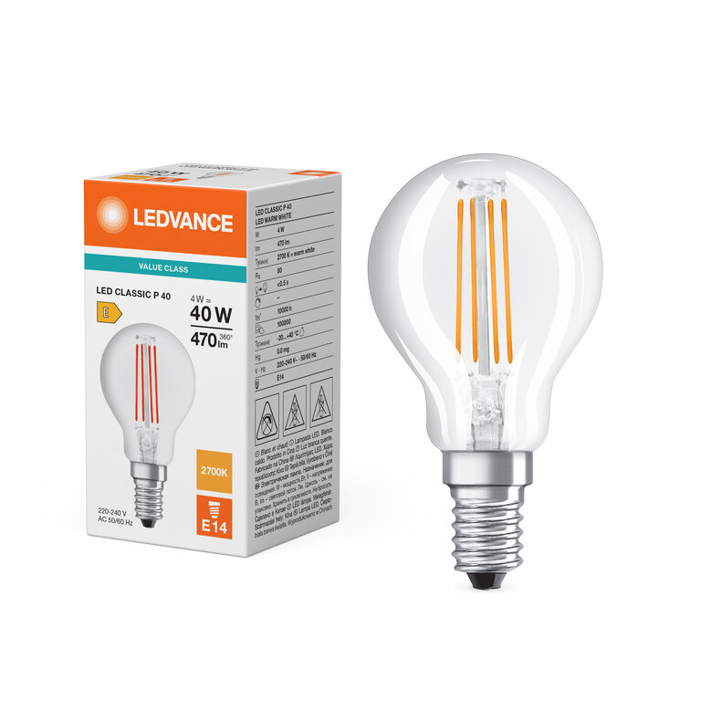 Osram / Ledvance LED Filament Tropfen P klar 300° Value 4-40W/827 warmweiß 470lm E14 220-240V