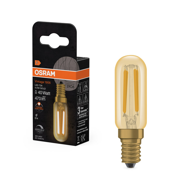 Osram / Ledvance LED Filament Vintage 1906 Special T26 klar 320° 4,8-40W/822 extra warmweiß 470lm E14 220-240V dimmbar