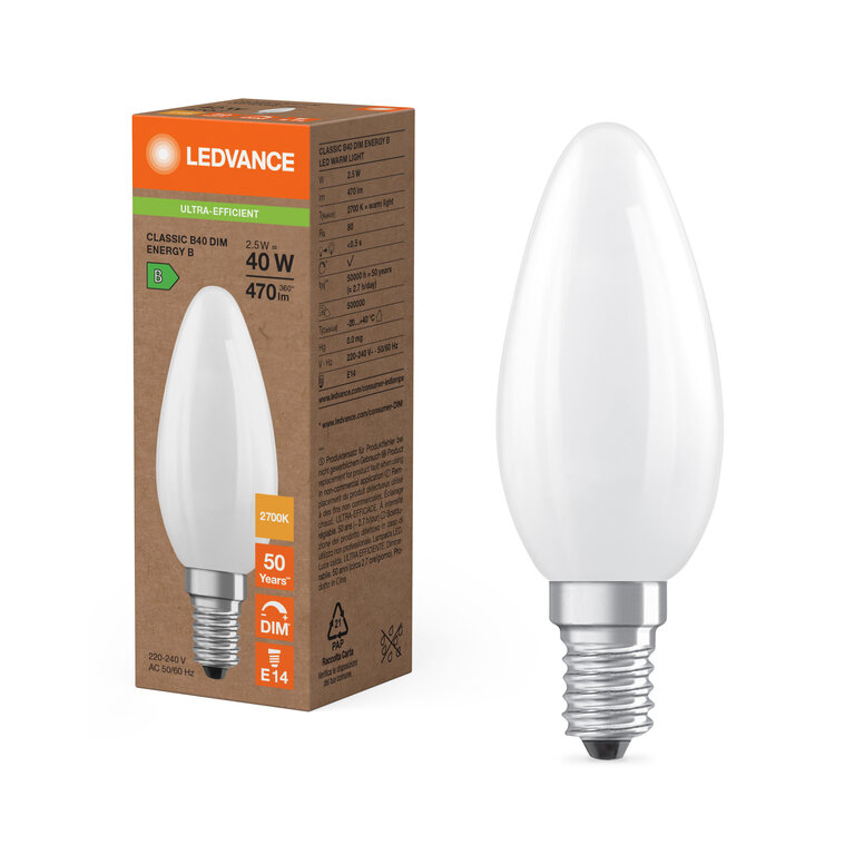 Osram / Ledvance LED Filament Kerze B matt 300° Superior 2,5-40W/827 warmweiß 470lm E14 220-240V dimmbar