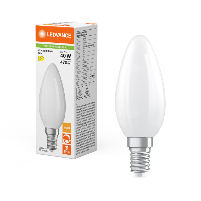 Osram / Ledvance LED Filament Kerze B matt 320° Performance 3,4-40W/827 warmweiß 470lm E14 220-240V dimmbar