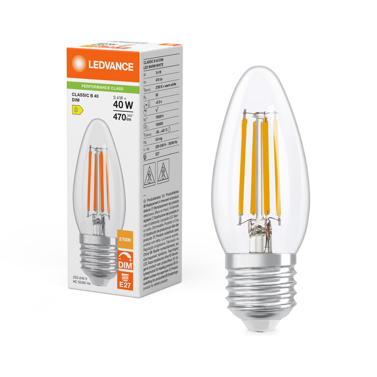 Osram / Ledvance LED Filament Kerze B klar 320° Performance 3,4-40W/827 warmweiß 470lm E27 220-240V dimmbar
