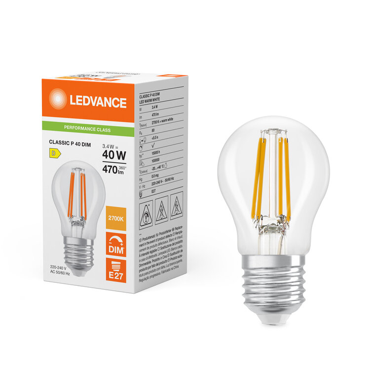 Osram / Ledvance LED Filament Tropfen P klar 320° Performance 3,4-40W/827 warmweiß 470lm E27 220-240V dimmbar