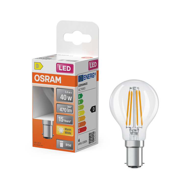 Osram / Ledvance LED Filament Star Tropfen P klar 300° 3,4-40W/827 warmweiß 470lm B15d 220-240V