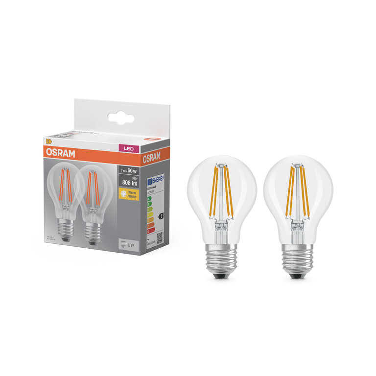 Osram / Ledvance LED Filament Base Classic A klar 300° 7-60W/827 warmweiß 806lm E27 220-240V 2er Pack