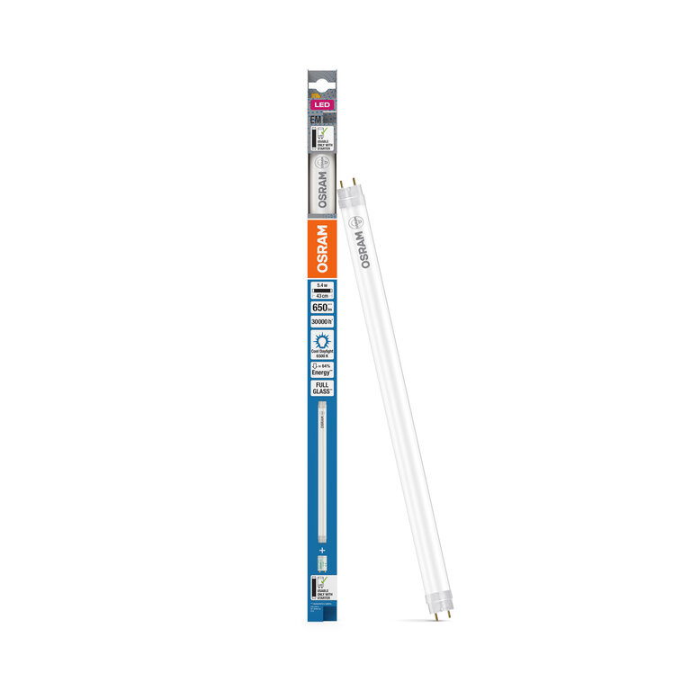 Die Osram / Ledvance LED Tube T8 mit einer Länge von 438 mm ist eine moderne und effiziente Lösung für die Beleuchtung verschiedenster Räume. Mit einer Leistungsaufnahme von 5,4 Watt ersetzt sie herkömmliche Leuchtstoffröhren mit einer deutlich höheren Wattzahl und sorgt dabei für eine gleichmäßige und helle Ausleuchtung. Die LED Röhre ist speziell für den Betrieb mit konventionellen oder verlustarmen Vorschaltgeräten sowie direkt mit Netzspannung geeignet, was ihre Einsatzmöglichkeiten besonders flexibel macht. Dank des G13 Sockels ist sie einfach und schnell zu installieren und kann in vielen bestehenden Leuchten verwendet werden.Angenehmes Tageslichtweiß für produktive Umgebungen