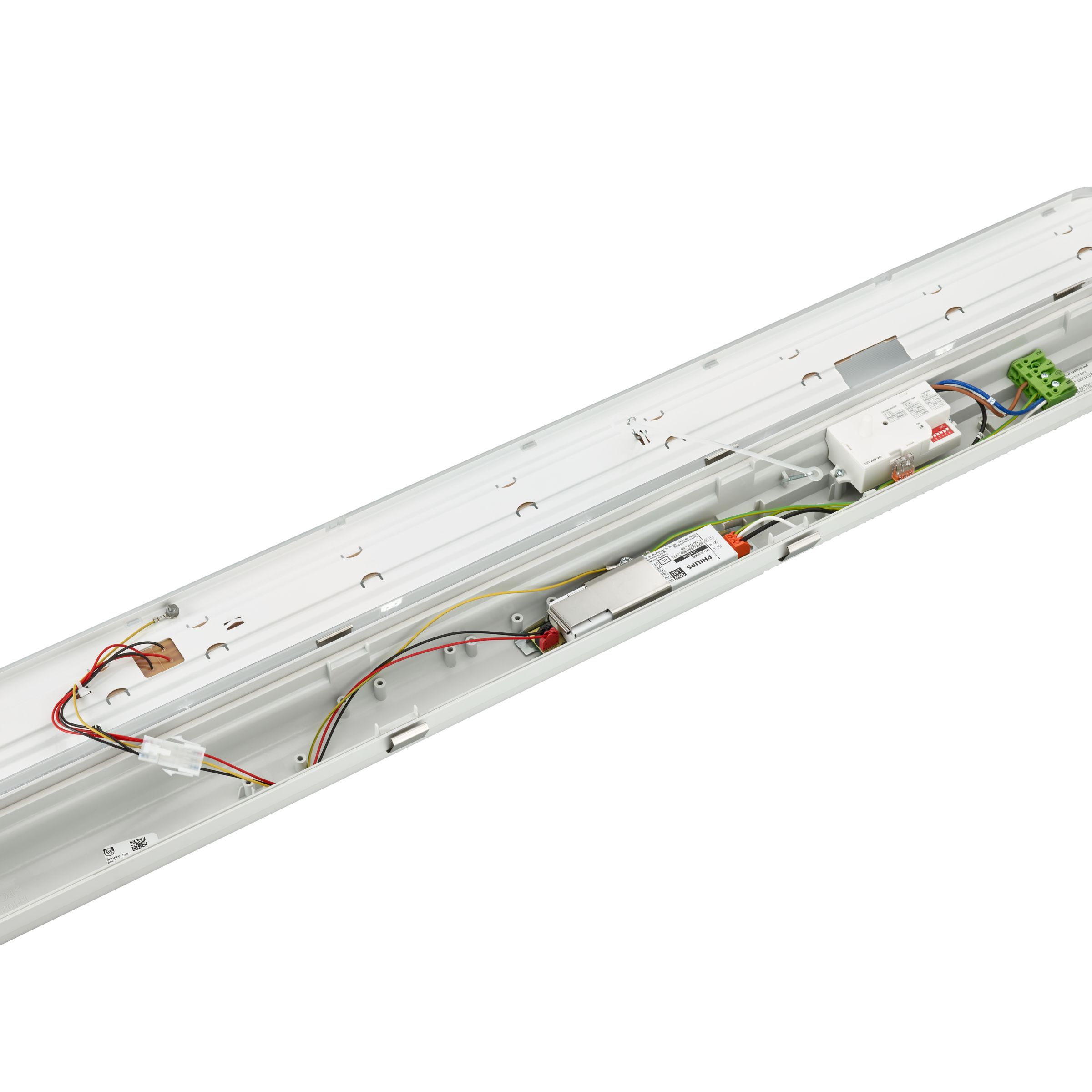 Die Philips LED CoreLine Feuchtraumleuchte WT120C überzeugt durch ihr robustes und zugleich schlankes Design. Mit einer Länge von 1215 mm ist sie hervorragend für den Einsatz in unterschiedlichsten Feuchträumen geeignet – beispielsweise in Kellern, Waschräumen, Werkstätten, Garagen oder Parkhäusern. Das satinierte Gehäuse sorgt für eine dezente und gleichmäßige Lichtverteilung und fügt sich harmonisch in jedes Raumkonzept ein. Die Verarbeitung hochwertiger Materialien garantiert Langlebigkeit sowie eine zuverlässige Schutzwirkung gegen Feuchtigkeit und Staub.Leistungsstarke und effiziente LED-Technologie