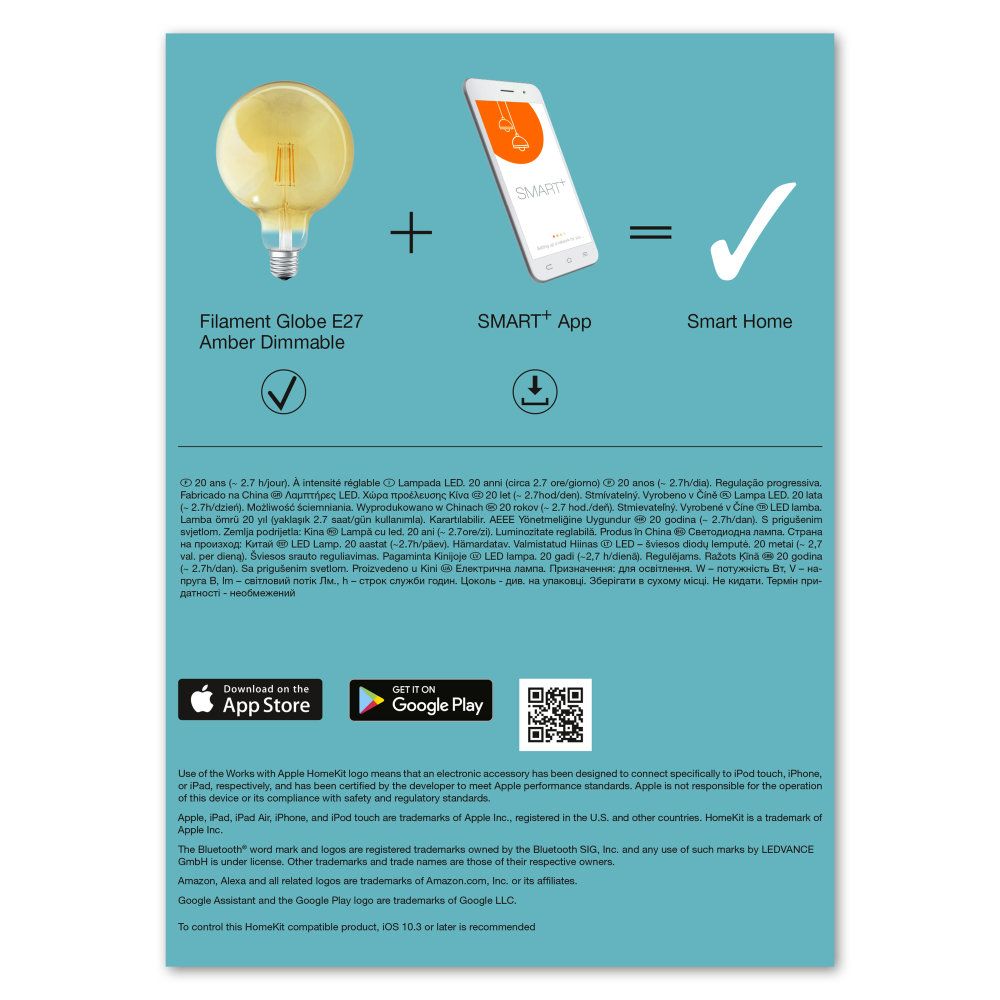 - Freitextfeld 1: <p><strong>Produktvorteile</strong></p> <ul class="simplelist"> <li>Lampen mit innovativer LED-"Filament"-Technologie</li> <li>Einfache Installation und Nutzung</li> <li>Bis zu 80 % weniger Energieverbrauch gegenüber Halogenlampen</li> <li>Enthält kein Quecksilber</li> </ul> <p><strong>Anwendungsgebiete</strong></p> <ul class="simplelist"> <li>Allgemeinbeleuchtung</li> <li>Außenanwendungen nur in geeigneten Leuchten</li> </ul> <p><strong>Produkteigenschaften</strong></p> <ul class="simplelist"> <li>LED-Lampe mit intelligenter kabelloser Steuerungstechnik</li> <li>Verfügbar mit klarem oder bernstein-gold getöntem Glaskolben</li> <li>Steuerung über LEDVANCE SMART + App (ab Android 6.0) oder Apple Home App (ab iOS 10)</li> <li>Für vollen Funktionsumfang bei Steuerung über Apple Home App Verbindung mit Apple TV (ab tvOS 10) oder iPad (ab iOS 10) notwendig</li> <li>Dimmbar</li> <li>Netzwerkprotokoll: Bluetooth</li> <li>Lebensdauer: bis zu 20.000 h</li> </ul> <p><strong>Technische Ausstattung</strong></p> <ul class="simplelist"> <li>Für Steuerung über LEDVANCE SMART + App Android-Smartphone (ab Android 6.0) erforderlich</li> <li>Für Steuerung über Apple Home App iPhone (ab iOS 10), iPad (ab iOS 10), Apple TV (ab tvOS 10) oder Apple Watch (ab watchOS 2) erforderlich</li> </ul>