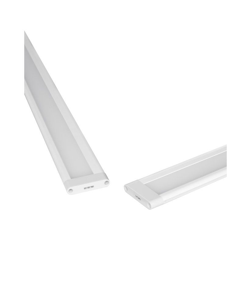 - Freitextfeld 1: <b>Produktvorteile</b><br> - Niedervoltleuchte für DC-Betrieb mit externem Treiber<br> - Sehr schlanke Form<br> - Homogene Lichtverteilung<br> - Einfache und schnelle Befestigung auf fast jeder Oberfläche (Klebestreifen oder Schrauben)<br><br> <b>Anwendungsgebiete</b><br> - Regal- und Unterbaubeleuchtung<br><br> <b>Produkteigenschaften</b><br> - Lichtstrom: bis zu 470 lm<br> - Ein- und Ausschalten durch Bewegungen mit 5 cm Abstand vor dem Infrarot-Bewegungssensor<br> - Stufenloses Dimmen durch Abdecken des Infrarot-Bewegungssensor in 5 cm Abstand für mind eine Sekunde<br> - Material: Aluminium<br> - Produktfarbe: Weiß<br> - Verfügbar in zwei Längen: 30 cm und 50 cm<br> - Verfügbar als einfaches und doppeltes Leuchten-Set<br><br> <b>Technische Ausstattung</b><br> - Externer Netzadapter (Kabellänge: 1,5 m) enthalten