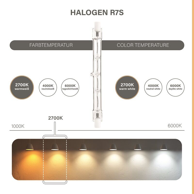 "R7s" bezeichnet den Sockeltyp der Halogenlampe. Es handelt sich um eine lineare Lampe mit zwei Sockeln an den Enden, die oft in Röhrenform gebaut ist. R7s-Lampen haben Stifte, die in spezielle Halterungen eingesetzt werden. Sie sind für 230-Volt-Netzspannung geeignet und werden häufig in Flutern und Außenleuchten verwendet.