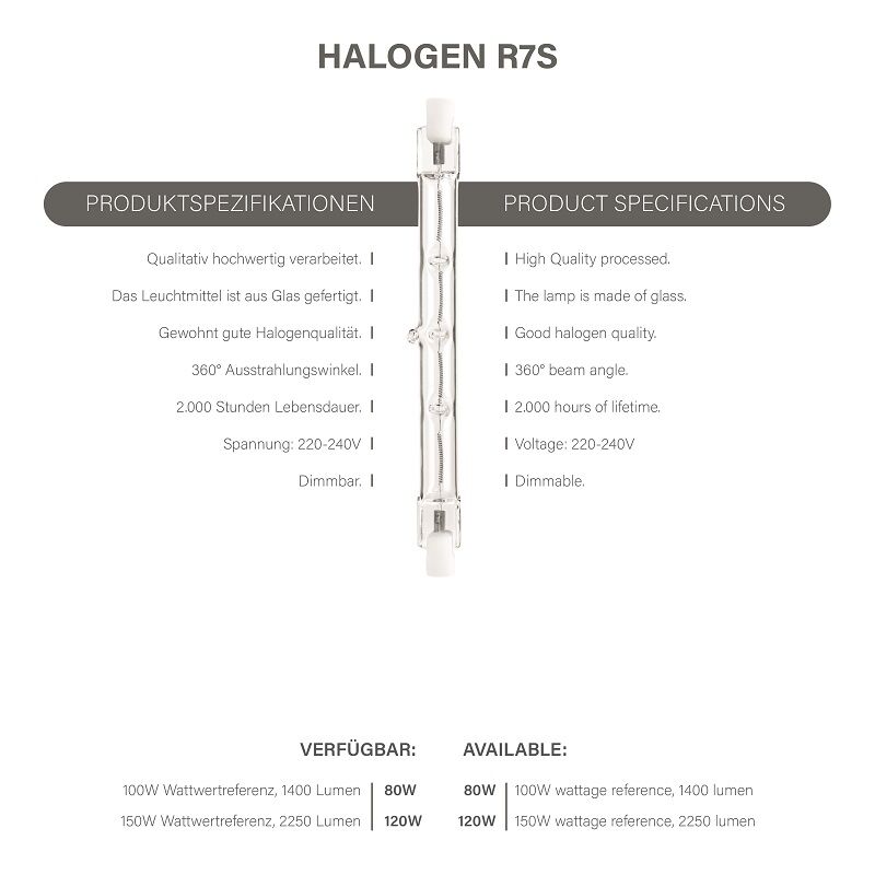 "R7s" bezeichnet den Sockeltyp der Halogenlampe. Es handelt sich um eine lineare Lampe mit zwei Sockeln an den Enden, die oft in Röhrenform gebaut ist. R7s-Lampen haben Stifte, die in spezielle Halterungen eingesetzt werden. Sie sind für 230-Volt-Netzspannung geeignet und werden häufig in Flutern und Außenleuchten verwendet.