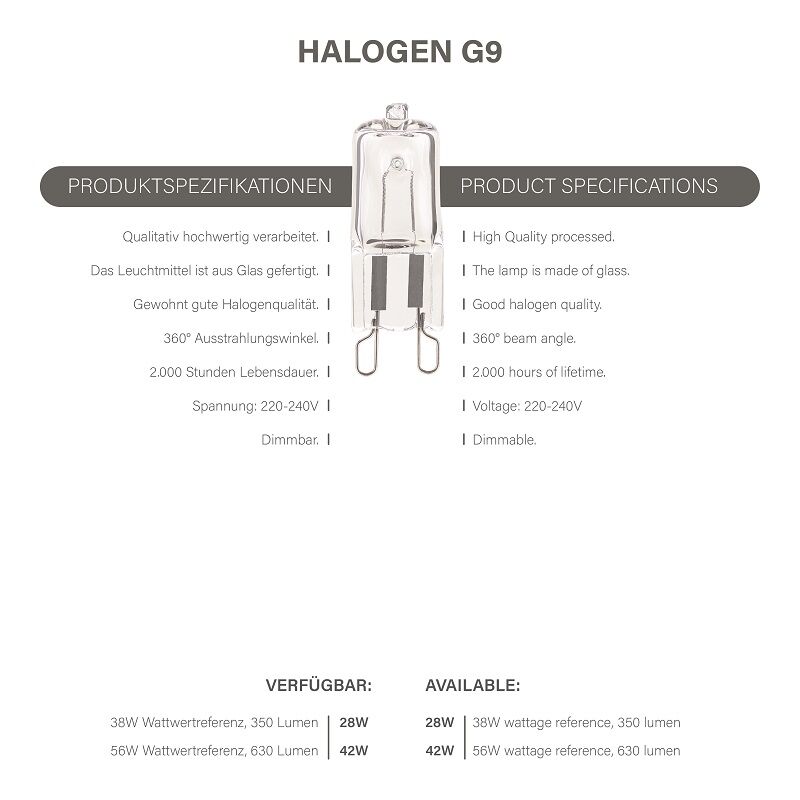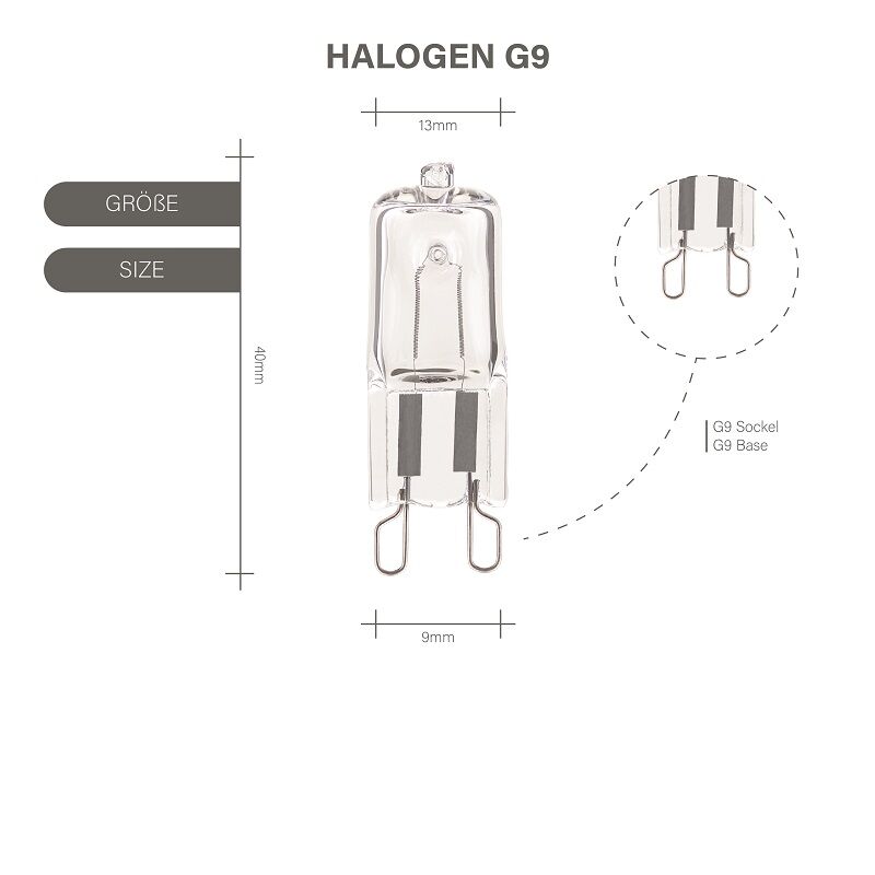 Die Bezeichnung "G9" beschreibt den Sockeltyp der Lampe. "G" steht für einen Stiftsockel, und die Zahl "9" gibt den Abstand der beiden gebogenen U-Stifte in Millimetern an. G9 Halogenlampen haben zwei gebogene Drahtstifte, die in die entsprechende Fassung gesteckt werden.