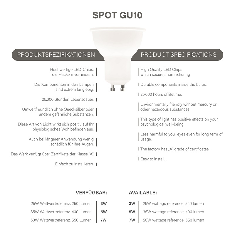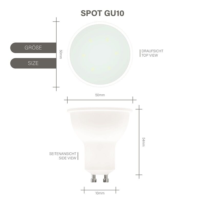 Ein GU10 LED-Leuchtmittel ist eine LED-Lampe mit einem GU10-Sockel, der zwei Stifte besitzt, die sich durch eine leichte Drehung in die Fassung einrasten lassen. GU10-Leuchtmittel werden häufig in Spotlights und Einbauleuchten verwendet.