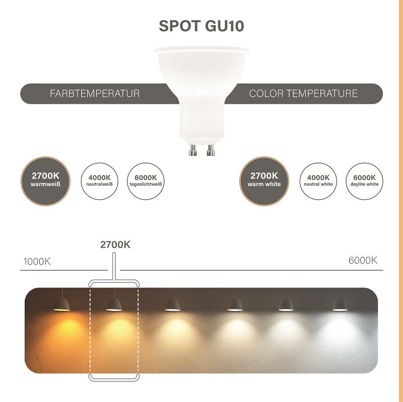 GU10 LED-Spots haben eine lange Lebensdauer, die typischerweise zwischen 15.000 und 25.000 Stunden liegt. Das bedeutet, dass sie viele Jahre halten können, selbst bei regelmäßiger Nutzung.