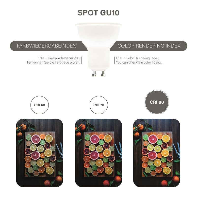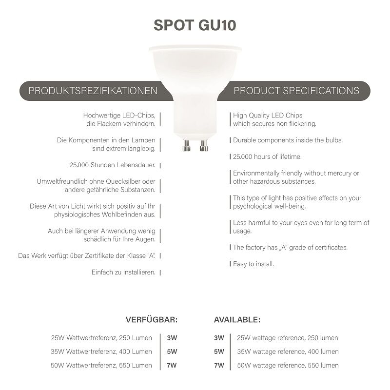 Ein GU10 LED-Leuchtmittel ist eine LED-Lampe mit einem GU10-Sockel, der zwei Stifte besitzt, die sich durch eine leichte Drehung in die Fassung einrasten lassen. GU10-Leuchtmittel werden häufig in Spotlights und Einbauleuchten verwendet.