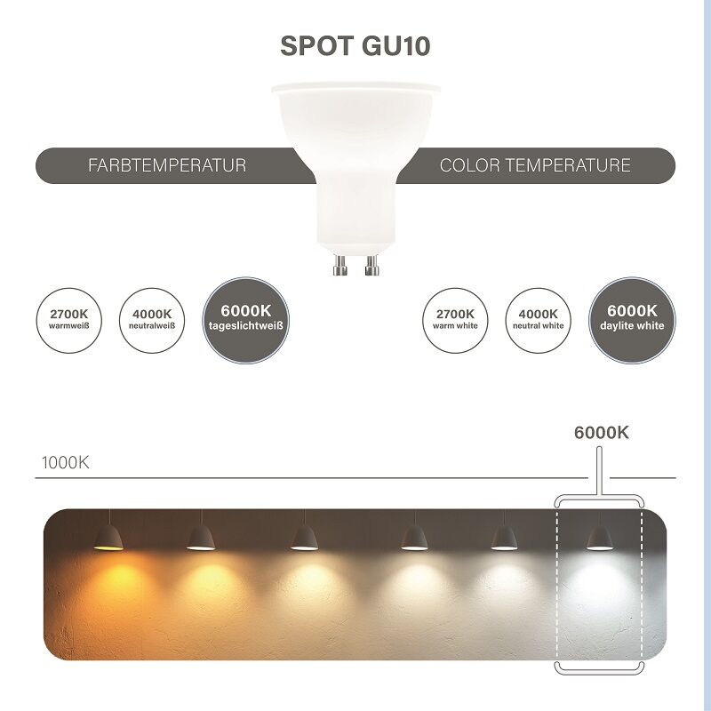 Ein GU10 LED-Leuchtmittel ist eine LED-Lampe mit einem GU10-Sockel, der zwei Stifte besitzt, die sich durch eine leichte Drehung in die Fassung einrasten lassen. GU10-Leuchtmittel werden häufig in Spotlights und Einbauleuchten verwendet.