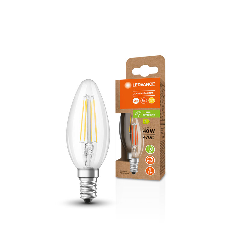 Osram / Ledvance LED Filament Kerze B klar 300° Superior 2,9-40W/827 warmweiß 470lm E14 220-240V dimmbar