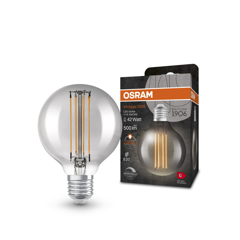 Osram / Ledvance LED Filament Vintage 1906 Globe G80 rauchig 320° 11-42W/818 extra warmweiß 500lm E27 220-240V dimmbar