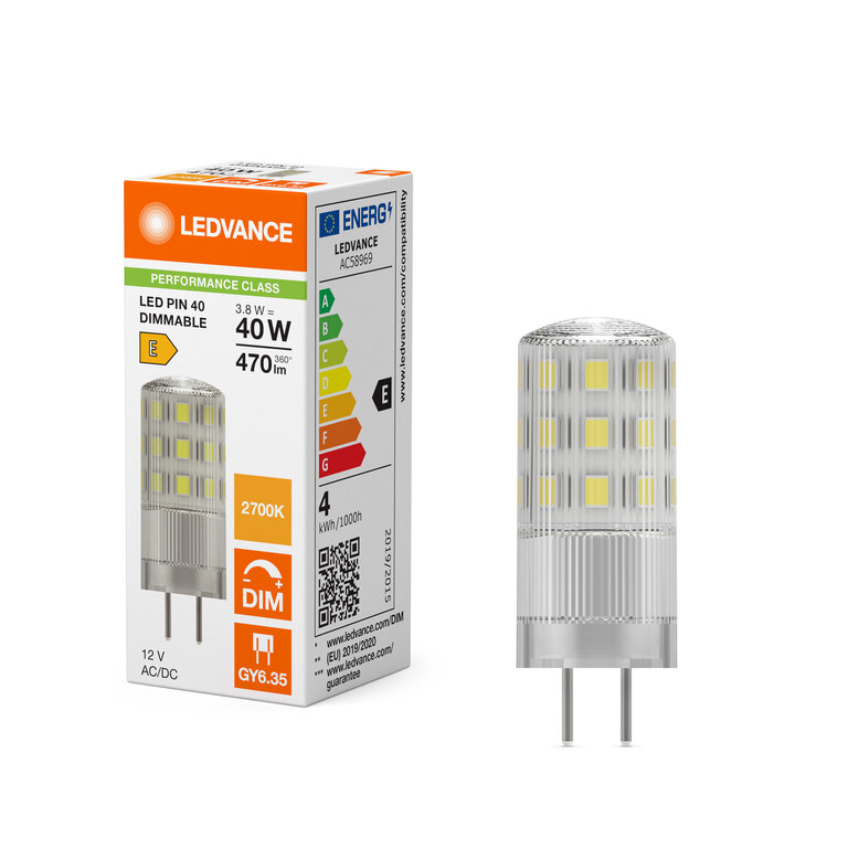 Osram / Ledvance LED Pin klar 320° Performance 3,8-40W/827 warmweiß 470lm GY6.35 AC/DC 12V dimmbar