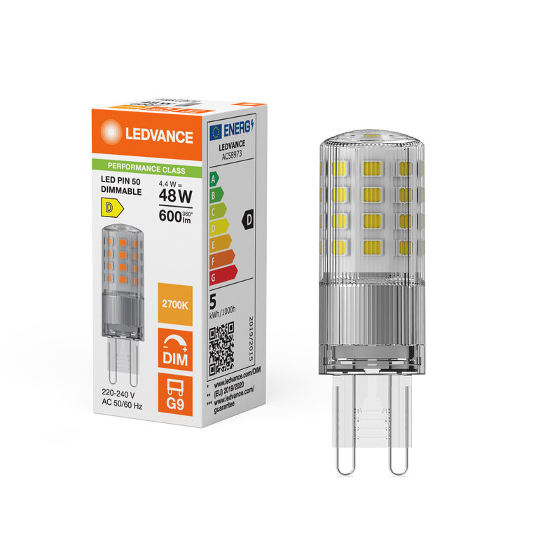Osram / Ledvance LED Pin klar 320° Performance 4,4-48W/827 warmweiß 600lm G9 220-240V dimmbar